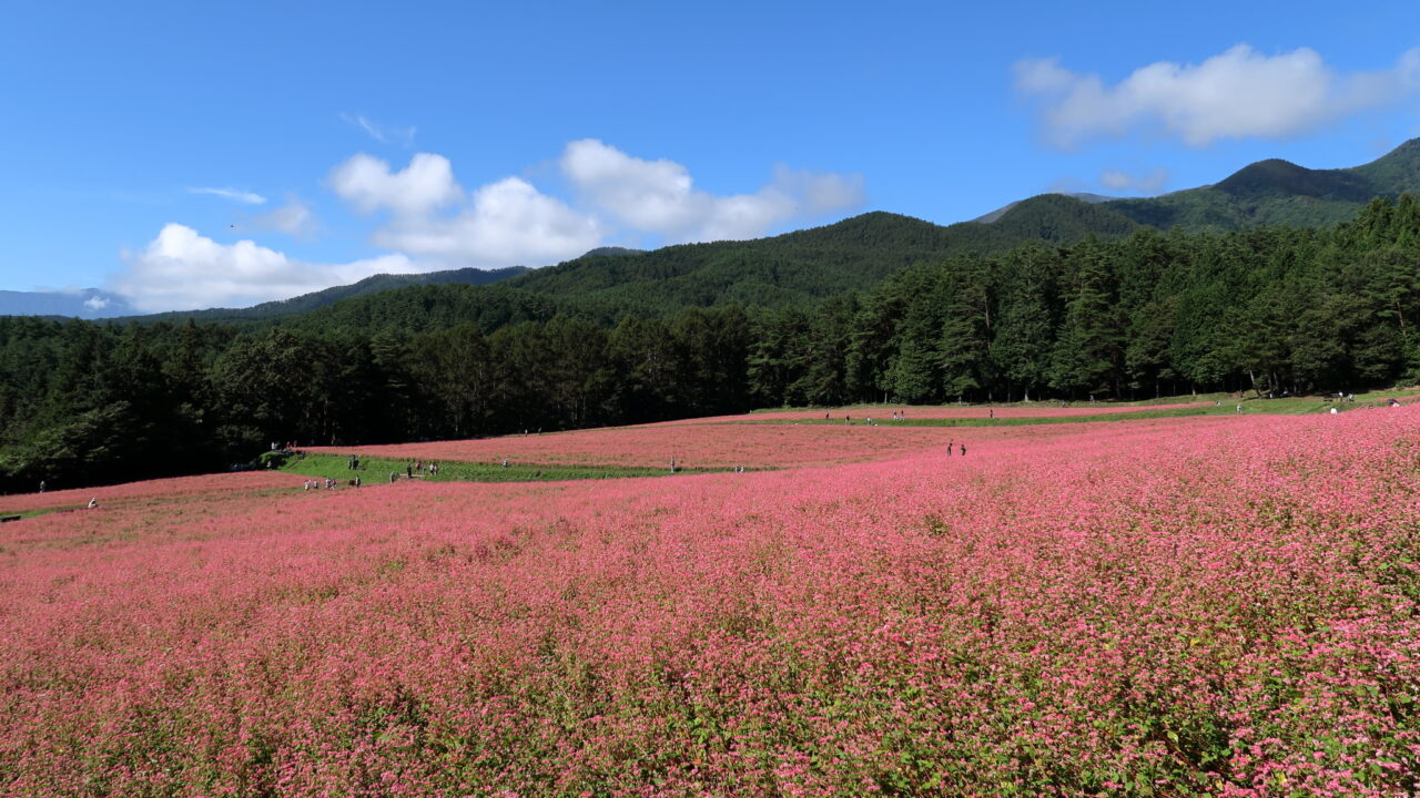 赤そばの里(あかそばのさと)とは、「高嶺ルビー」と呼ばれる赤い花の咲くそばが、標高900m・約4.2ha(東京ドームくらい)の広大な畑に赤い絨毯のように美しく咲き乱れる場所です。一般的な蕎麦の花は可憐な白色ですが、こちらは珍しい赤色であるというのが魅力で、地元の有志「古田の里 赤そばの会」の方々が毎年大切に育てています。