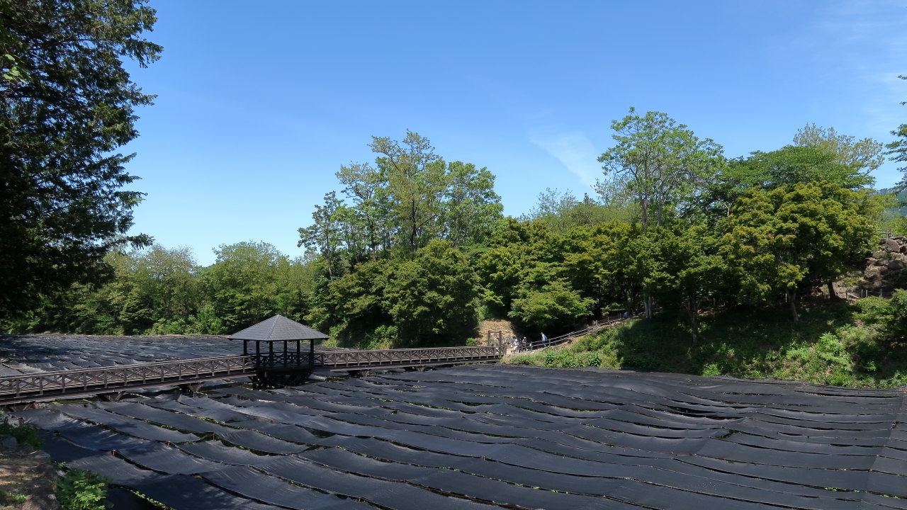 北アルプスの眺望もいいですね。直射日光を避けるためにわさび畑は寒冷紗(黒色のネット)で覆われています・・・一面に広がるわさび畑が見られず残念。。