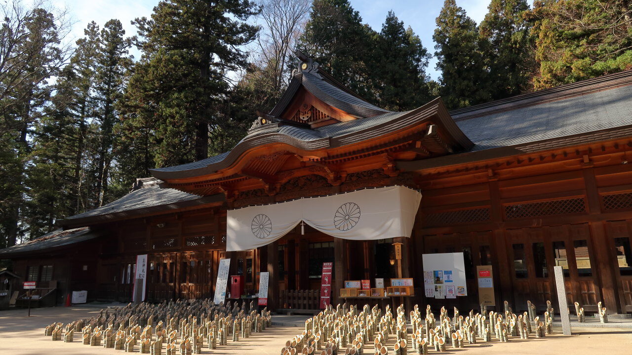鳥居をくぐると石碑の前に竹灯籠が広がっています。毎年12月に神竹灯(かみあかり)といわれるイベントが開催されており、夜には境内を中心に10000本の竹灯篭が灯されて幻想的な風景をつくりだします。