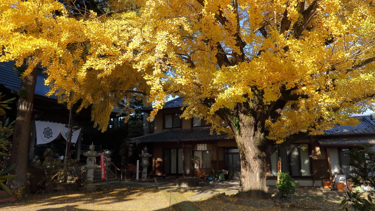 秋には鮮やかな黄色に染まる風景が魅力で、落葉後は境内を黄色の絨毯のように彩ります。樹齢約400年、幹周3.5m、樹高20m、南箕輪村の天然記念物に指定されています。
