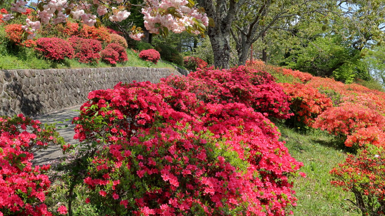 公園入口にある第一駐車場、石垣の間で鮮やかに咲くツツジがとてもきれいですね。