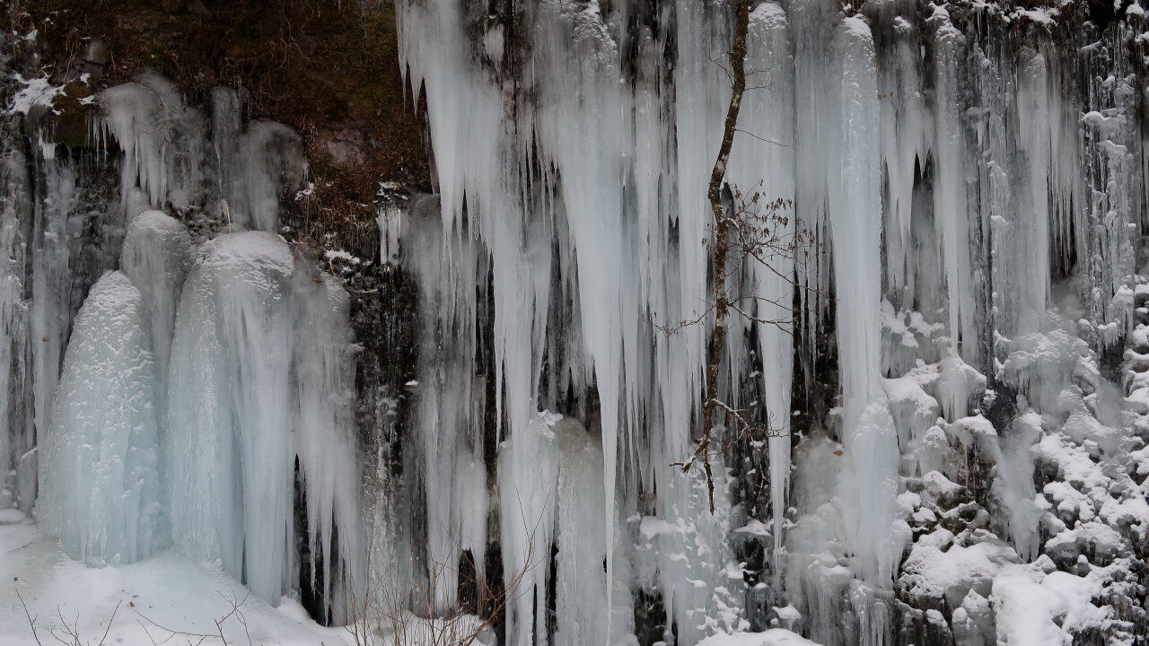 渓谷沿いに連なる高さ約5m・幅30~40mの氷瀑が見事ですね。岩肌からしみ出す水が凍ってつくられますが、今年は1月中旬頃まで暖かい日が続いたため例年より若干小ぶり?